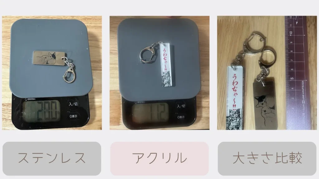似たようなサイズ感のアクリルキーホルダーは11.5gだったので、約2倍の重さがあります。